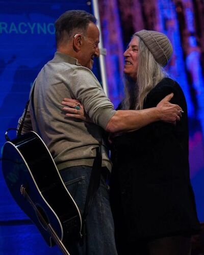 Bruce joins Patti Smith and her band on stage during the Tribeca Fim Festival. The occasion was the premiere of a new concert documentary about Smith, "Horses: Patti Smith and Her Band". The film documents the Los Angeles concerts in January 2016 where Smith performed her album, "Horses," to mark its 40th anniversary. Smith and band performed several hits, including "Dancing Barefoot" and "Gloria." After Smith introduced her band members, she said she had one more person to introduce. Bruce entered the stage to accompanied by a roaring of the crowd. Together, they performed "Because the Night and the finale "People Have The Power", for which they were joined by Michael Stipe.